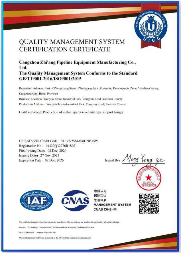 Cangzhou Zhiang Pipeline Equipment Manufac turing Co., Ltd. ist auf die Herstellung und Verarbeitung von Pipeline-Zubehör spezial isiert. Unser Unternehmen ist spezial isiert auf die Herstellung von Rohrs tützen, Rohrs chellen, Kalt isolation rohrs tützen, Wärme isolation rohrs tützen, festen Rohrs tützen, Gleit rohrs tützen, geführten Rohrs tützen, Roll rohrs tützen, Feder stützen und Kleiderbügeln, Dämpfer kraftwerks abweichungen und anderen verwandten Produkten.